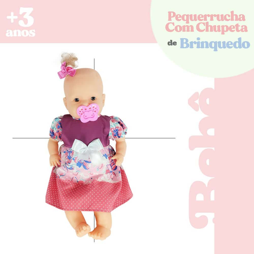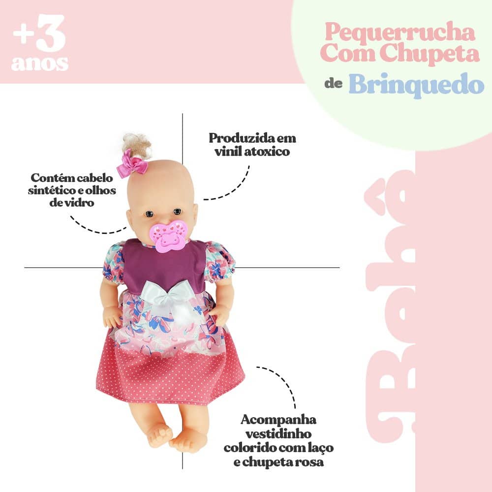 A Pequerrucha é uma linda boneca em vinil atóxico e com o corpo muito macio em enchimento, é uma delícia de abraçar, possui olhos de vidro e vem com uma linda roupinha, tem um cheirinho delicioso de bebê, parecendo muito com um bebê. Desperte a criatividade e a imaginação da sua criança, tornando-a a amiga perfeita para as brincadeiras. -Acompanha uma linda chupeta. -Recomendada para maiores de 01 ano ESPECIFICAÇÕES:Material: Polietileno, Vinil e Roupa em TecidoDimensões: Alt.: 45cm x Larg.: 19cmPeso: Aprox.430g Contém:Boneca Pequerrucha Com Chupeta