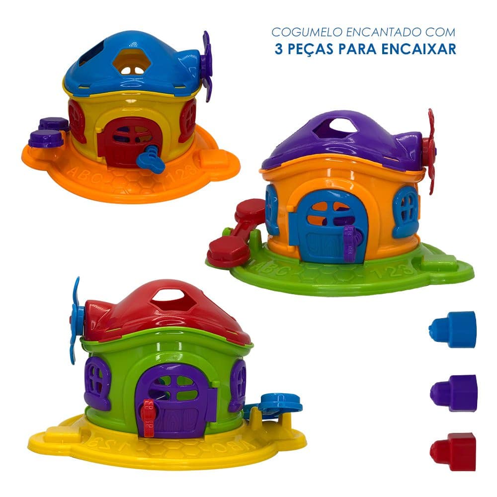 Com seu design em forma de cogumelo, conta com diversas cores vibrantes e adoráveis, despertando a curiosidade da criança. Acompanha também 3 peças para encaixar no telhado da casinha, fáceis de manusear e de tamanho compacto, perfeito para mãos pequenas, uma porta com chave para resgatar as peças na parte interior da casinha, um cata-vento que ao girar faz barulho e uma gangorra para encaixar as pecinhas na parte de fora da casinha.