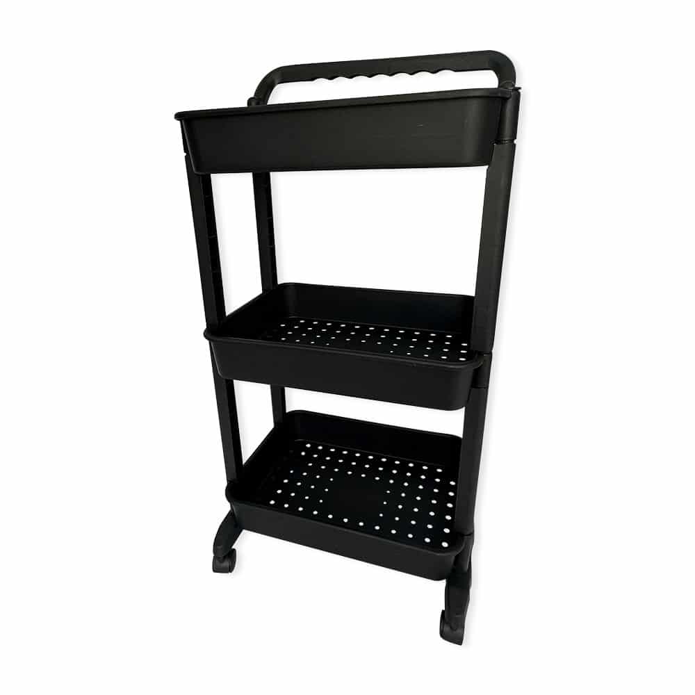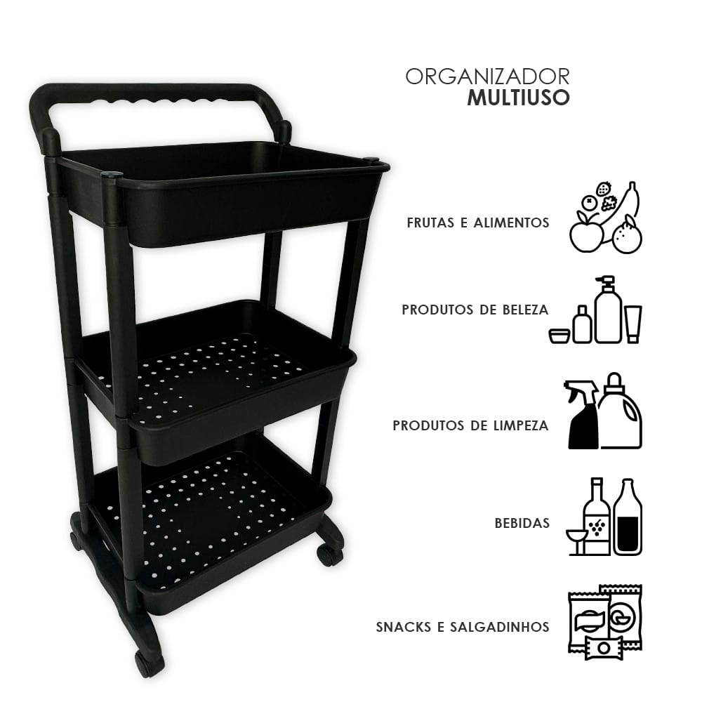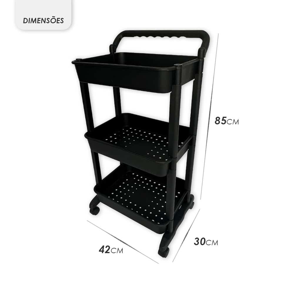 Carrinho Organizador Multiuso 3 Prateleiras Com Rodas  Para quem tem pouco espaço ou precisa de organização para seu estabelecimento, esse carrinho multiuso é essencial para atender suas necessidades.  Possui três andares de prateleiras espaçosas, ideal para organizar cosméticos, acessórios de beleza, produtos de higiene, produtos de limpeza, toalhas ou também na cozinha para armazenar mantimentos e frutas. Além disso, vem com rodinhas e uma alça para carregar para onde quiser.  ESPECIFICAÇÕES:Material: PlásticoDimensões: 85cm altura x 30cm profundidade x 42cm largura Altura de uma prateleira para outra é de 23cm São 3 prateleirasCor: Preta CONTÉM:01 Carrinho Organizador Multifuncional com rodinhas 3 Prateleiras Preta
