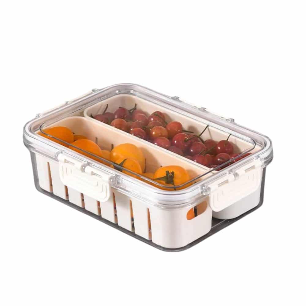 As duas cestas removíveis ajudam a manter tudo separado e acessível, promovendo uma organização inteligente e funcional. A tampa protetora garante que os alimentos fiquem livres de respingos e umidade, além de permitir o empilhamento de outros organizadores ou potes, aproveitando o espaço vertical da geladeira com espaço reduzido ou uso intenso do refrigerador. Leve, durável, fácil de limpar e com um visual clean que combina com qualquer ambiente, este organizador é muito mais que um acessório: é um aliado prático para transformar sua rotina na cozinha com elegância, funcionalidade e higiene.