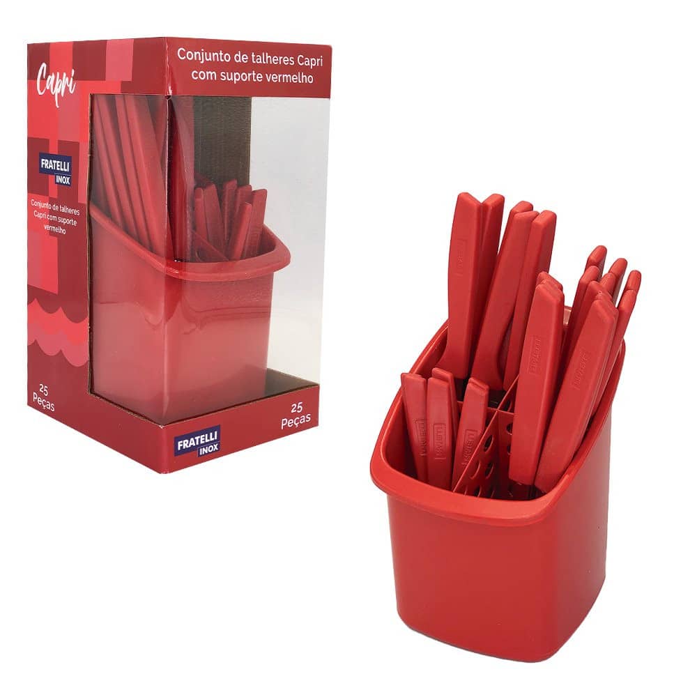 Conjunto de Talheres Capri 25 Peças – Vermelho Composto por talheres duráveis e de alta qualidade, esse conjunto irá adicionar um toque de elegância a qualquer ocasião. Seu acabamento vermelho fosco proporciona um visual moderno e sofisticado. Contando com 25 peças, sendo elas: 6 facas, 6 colheres, 6 garfos, 6 colheres de chá e 1 suporte, o conjunto é completo e versátil, você terá à disposição colheres, colheres de sobremesa, garfos e facas para atender a todas suas necessidades, desde almoços casuais até jantares formais.Além do seu design impecável, os talheres são ergonomicamente projetados para um manuseio confortável, com seu peso equilibrado e suas bordas suavemente arredondadas proporcionam uma experiência de uso agradável, garantindo que cada garfada ou corte sejam perfeitos. Fabricados com materiais de alta qualidade, os talheres são resistente e duráveis, o aço inox não enferruja, são projetados para o uso diário e manter o brilho por muito tempo, além do seu acabamento torna-los fáceis de limpar, permitindo que você desfrute de sua refeição sem se preocupar com a limpeza.