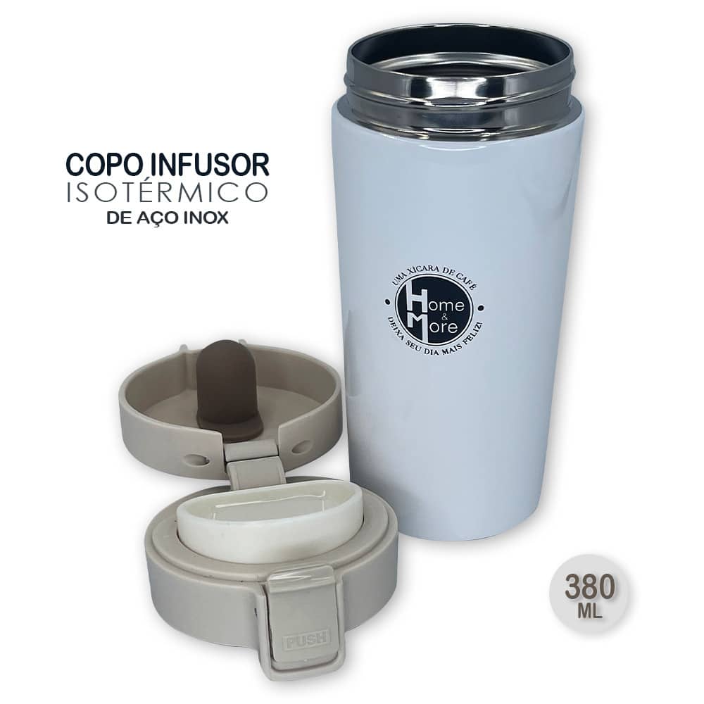 Copo Infusor Térmico 380ml Copo térmico perfeito para uso diário, possui tampa com ótima vedação conservando a temperatura interna por mais tempo e evitando que a bebida vaze. Possui também um filtro interno que evita a passagem do bagaço de suco ou chá. Produto fabricado com materiais isolantes da mais alta qualidade e Inox 304 atóxico.