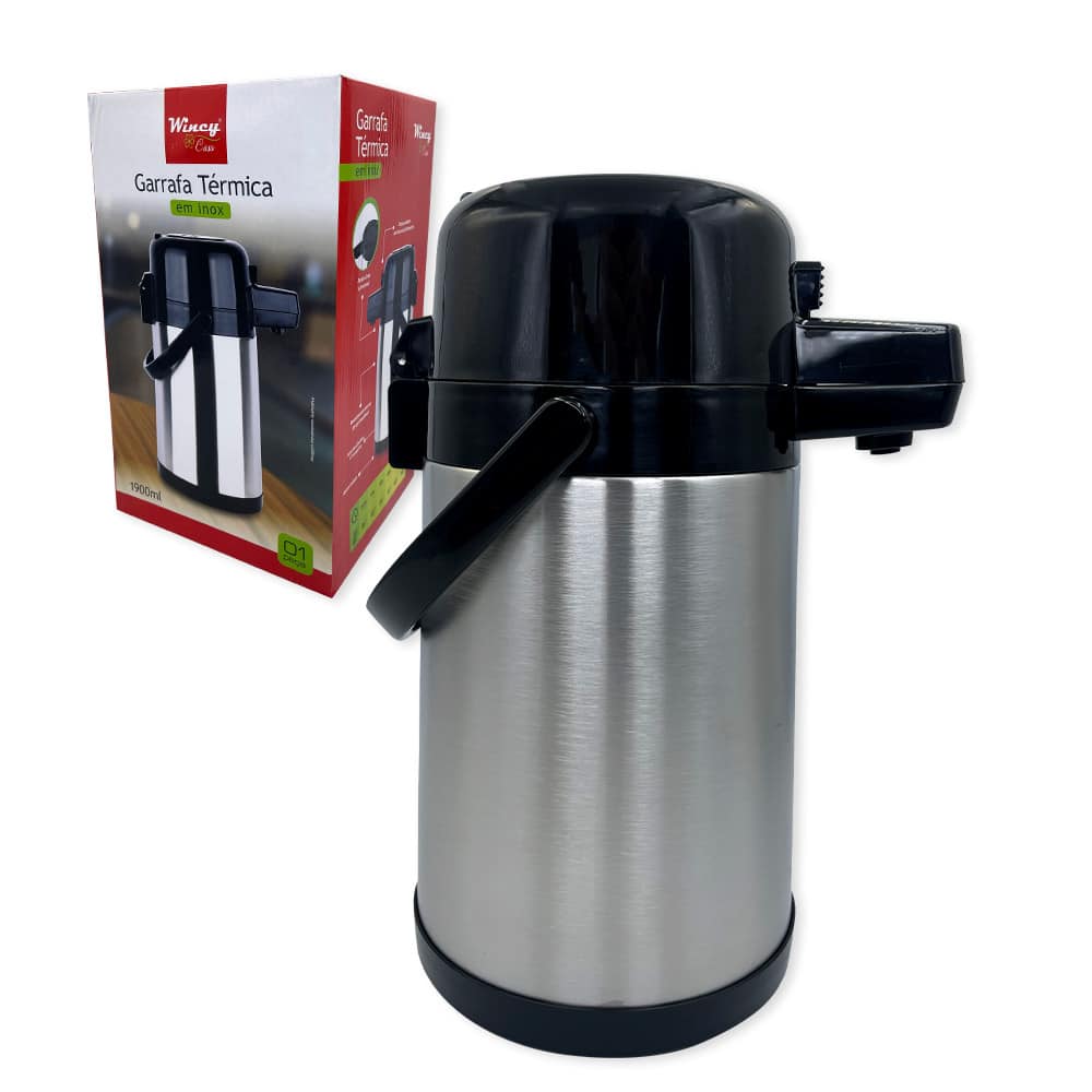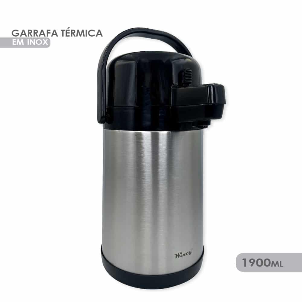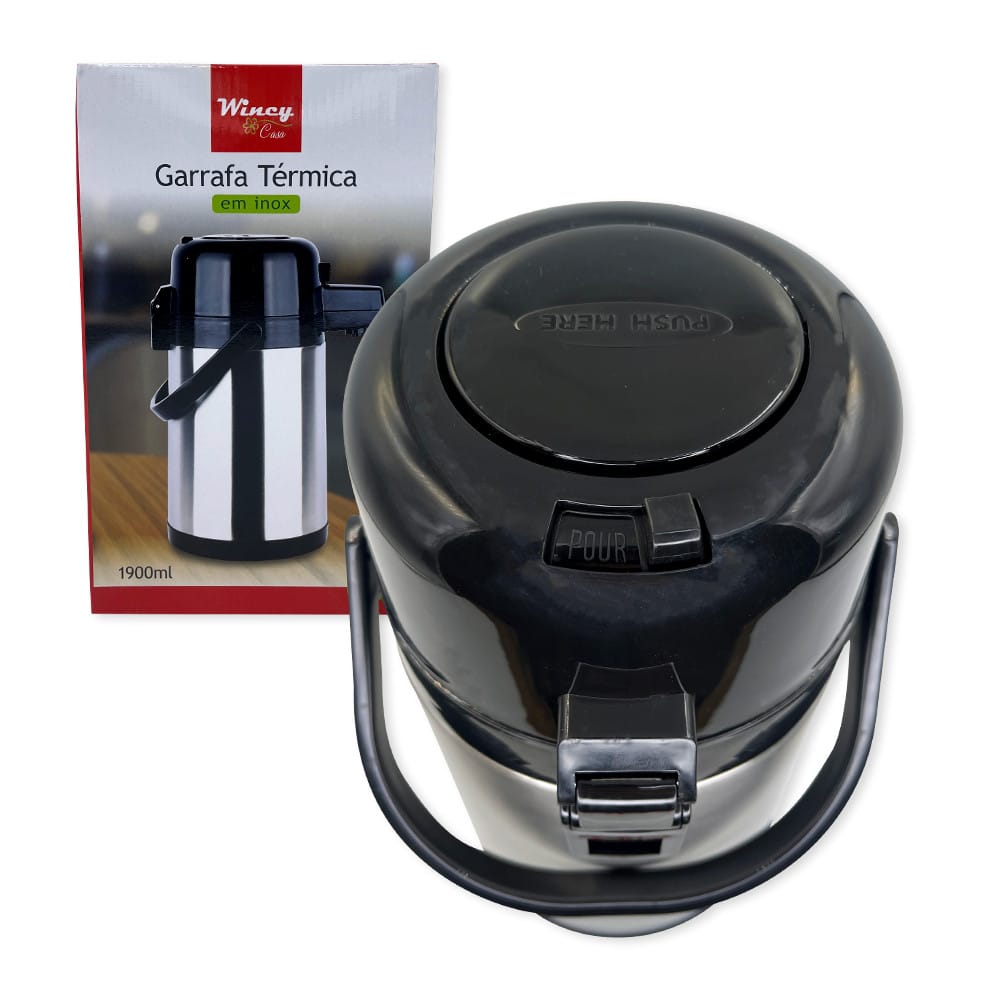 Garrafa Térmica em Inox 1900ml Essa garrafa é perfeita para servir aquele café gostoso bem quentinho e fresquinho. Tem um design clean e funcional, revestimento externo em aço inox e com alça para facilitar seu transporte.  A tampa é isolante e com trava de fechamento, auxilia para que o líquido interno não resfrie. Para abrir a garrafa por completo basta apertar a trava para higienizar a garrafa ou adicionar os líquidos. A garrafa tem duração térmica de 24h, nas primeiras horas a temperatura pode chegar em média até 95º e das 24h em seguida atinge uma média de 56º. ESPECIFICAÇÕES:- Material: Aço inox- Tamanho: 29cm altura x 18cm diâmetro- Capacidade: 1900ml- Térmica por até 24h CONTÉM:- 01 Garrafa Térmica 1900ml em Aço Inox