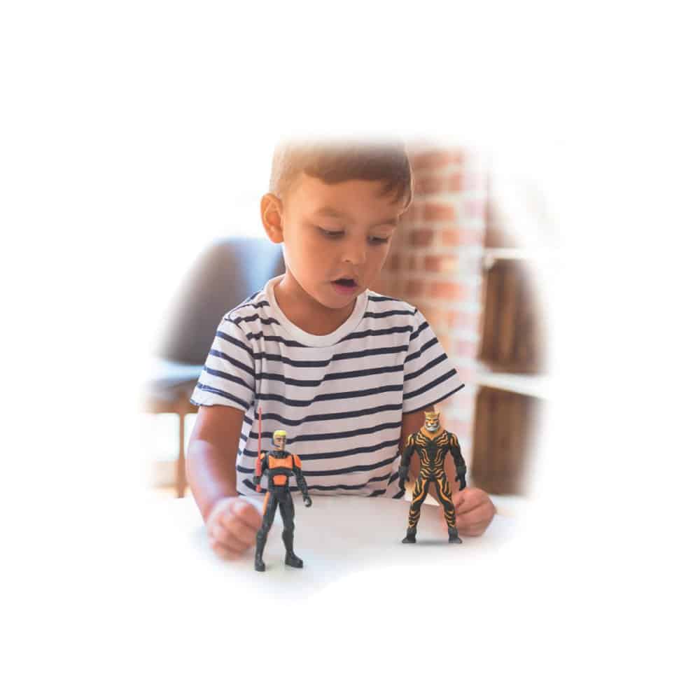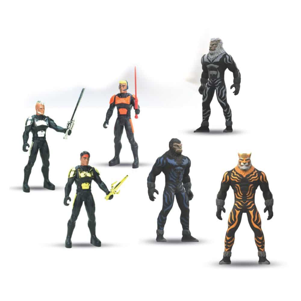 Estes bonecos articulados são inspirados em guerreiros com características de animais selvagens, trazendo um visual marcante que desperta o interesse e a imaginação das crianças.