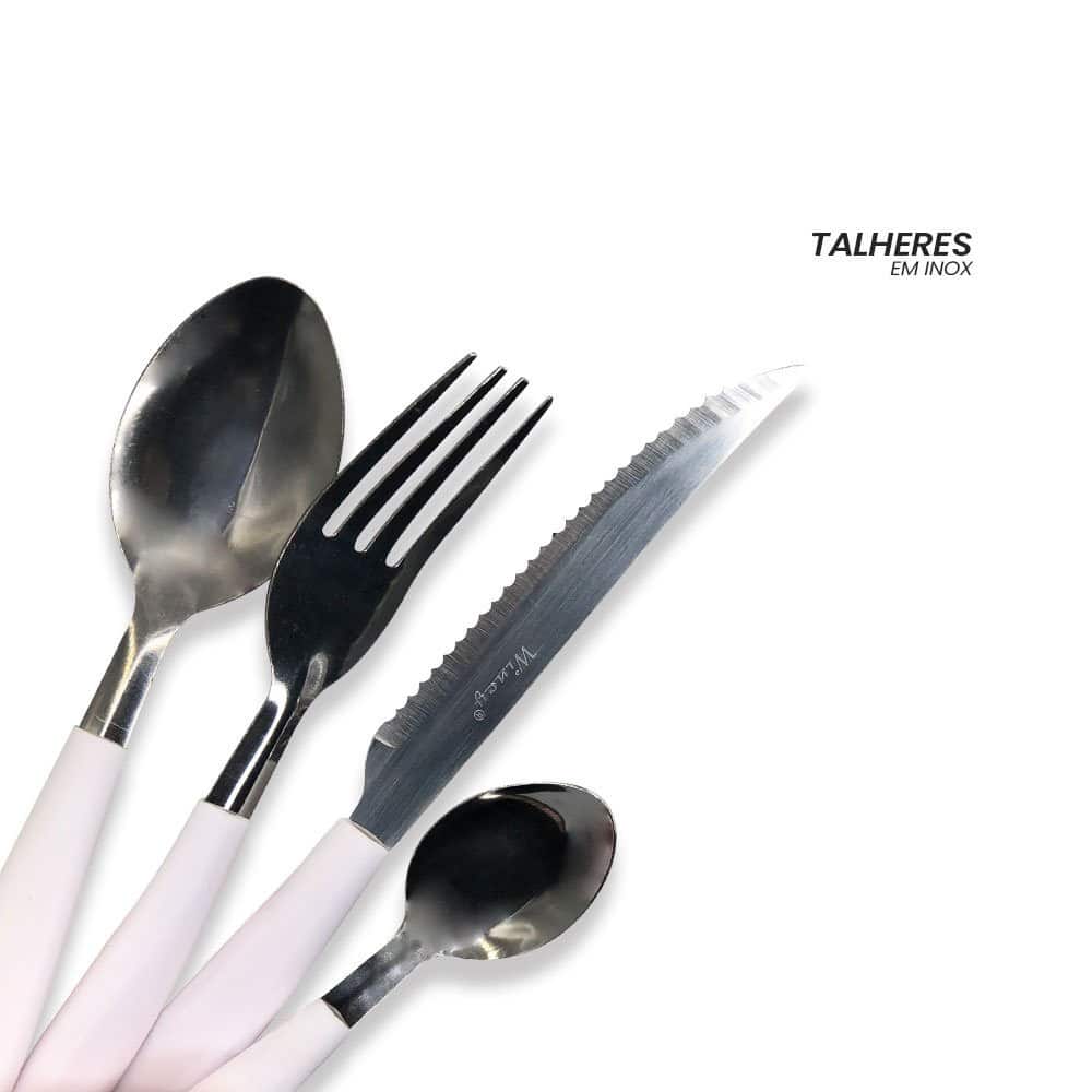 Kit de Talheres em Inox com 25 Peças – Branco Com um design sofisticado, esse conjunto de talheres será uma peça fundamental para servir seus convidados com elegância, em sua casa ou mesmo em seu restaurante. Adicionando mais beleza á sua cozinha, se adaptando em diversas ocasiões, seja na hora de fazer um churrasco com a família e os amigos, ou até mesmo para tomar aquele chá da tarde, desde o momento mais formal até o mais descontraído do seu dia. Contando com um porta talher, ajudando na separação e organização dos talheres. Contando com :-06 Facas para Churrasco;-06 Garfos de Mesa;-06 Colheres de Mesa;-06 Colheres de Chá;-01 Porta Talher. Feitos com material de alta qualidade, garantindo leveza e durabilidade, esse jogo de talheres será um verdadeiro diferencial na sua cozinha.   – Lavar com sabão neutro e pano ou esponja macia, para uma maior durabilidade do produto;- Não levar ao fogo ou microondas;- Nunca use esponja de aço comum para limpar inox, ela arranha as partes polidas e deixa minúsculas partículas que podem vir a provocar manchas.