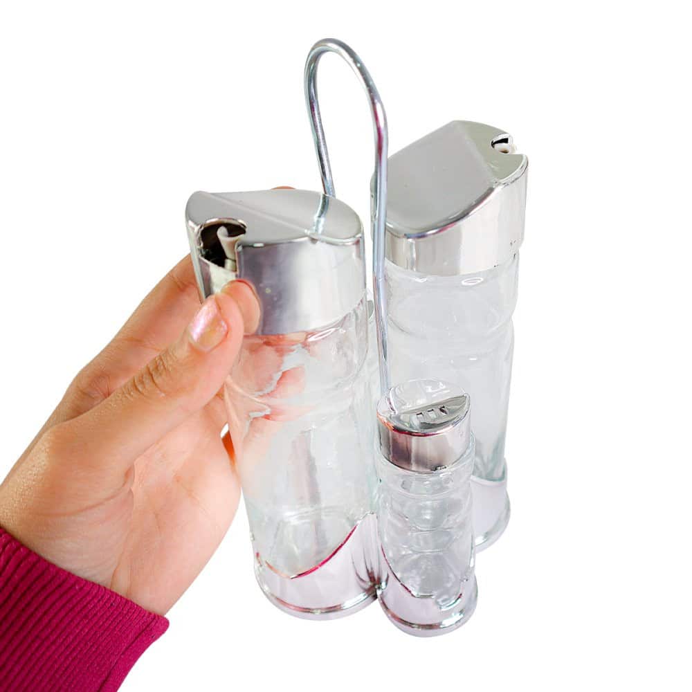 Seja para um jantar especial com os amigos ou para o uso diário, este kit é a escolha ideal para quem aprecia a boa culinária e a elegância na apresentação!Incluindo tudo o que você precisa para aprimorar o sabor de suas refeições favoritas, o conjunto conta com azeiteiro e vinagreiro que permitem que você adicione o toque perfeito de sabor aos seus pratos, enquanto o saleiro e o pimenteiro garantem que você ajuste o tempero de acordo com o seu gosto, além disso, conta também com suporte, proporcionando uma apresentação organizada e sofisticada na sua mesa de jantar e na cozinha.Feito com materiais de alta qualidade, não só adicionando estilo à sua casa, mas também facilitando a limpeza dos recipientes. O kit conta com:-01 Azeiteiro 160ml: Larg.: Diâmetro: 5cm x Alt.: 15,5cm;-01 Vinagreiro 160ml: Diâmetro: 5cm x Alt.: 15,5cm;-01 Saleiro 40ml: Diâmetro: 3cm x Alt.: 9cm;-01 Pimenteiro 40ml: Diâmetro: 3cm x Alt.: 9cm;-01 Suporte: Larg.: 11cm x Alt.: 19cm. *CUIDADOS:-Não limpar as peças com esponjas ásperas, palha de aço ou produtos abrasivos;-Usar somente esponja macia e sabão neutro;-Manter fora do alcance das crianças. ESPECIFICAÇÕES:Material: Vidro, Polipropileno, e Aço Inoxidável.Peso: Aprox.: 440g CONTÉM:01 KIT GALHETEIRO COM 4 PEÇAS