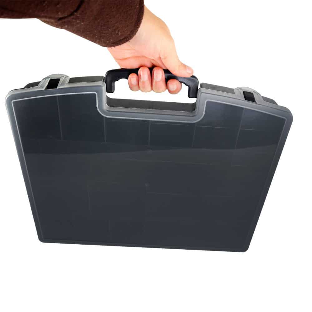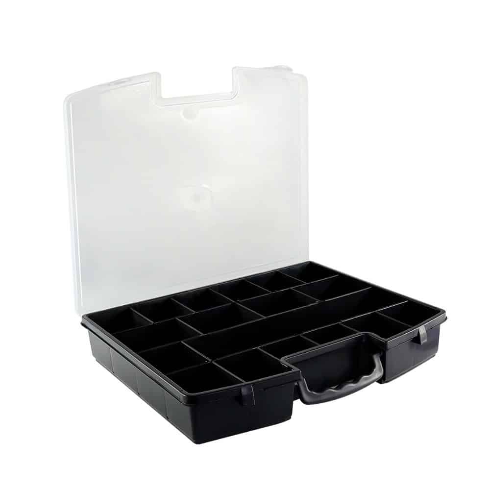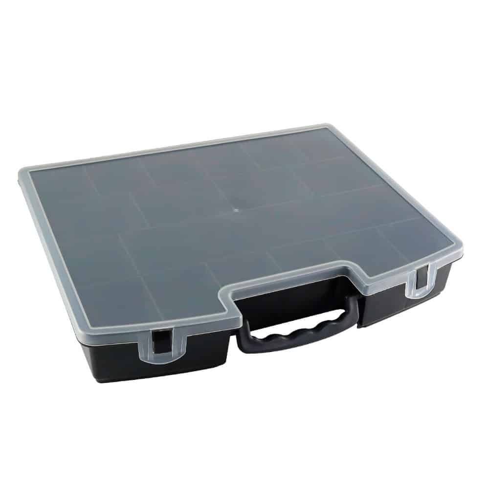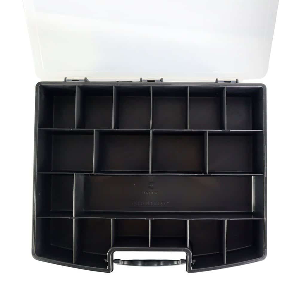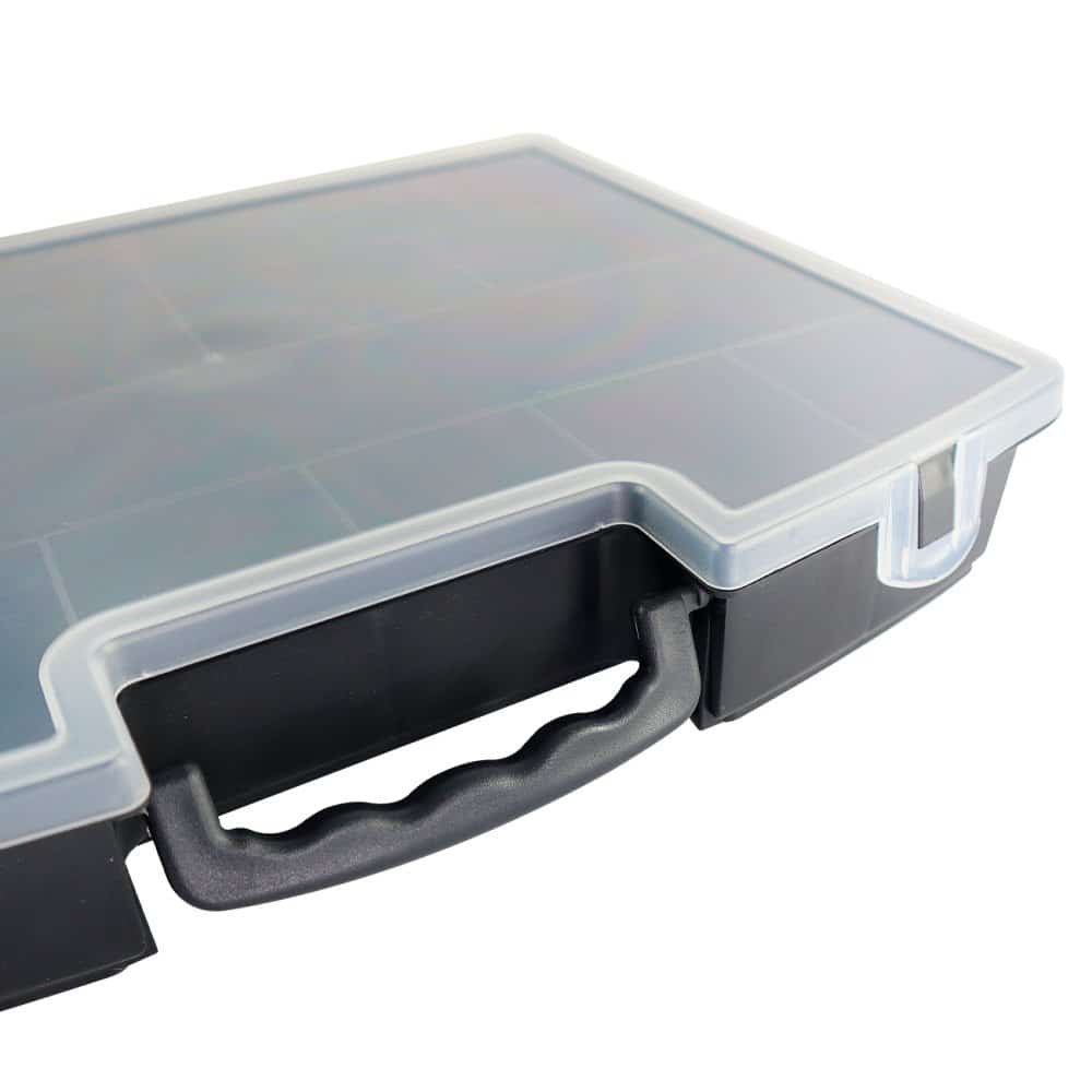 Esta maleta com tampa transparente será a solução ideal para manter suas ferramentas e acessórios sempre organizados e facilmente acessíveis.Seu design compacto conta com uma alça para facilitar o transporte e tampa transparente para facilitar a visualização dos itens, tornando-a perfeita para o uso em casa ou trabalho. Com travas de segurança na tampa que asseguram que suas ferramentas fiquem firmes no lugar, evitando bagunças e danos durante o transporte.Conta com 18 espaços de armazenamento de diversos tamanhos, permite que você guarde diversos tipos de itens, desde ferramentas até acessórios de artesanato.Feita com materiais resistentes e de qualidade, garante durabilidade e seguranças para as suas ferramentas, evitando possíveis acidentes e danos. Conta com 18 espaços sendo eles com 5 tamanhos diferentes, sendo eles:-6cm x 6cm;-6cm x 4cm;-29cm x 6,5cm;-9cm x 6,5cm;-6,5cm x 6,5cm  ESPECIFICAÇÕES:Material: PolipropilenoDimensões: Comprimento: 36,2cm x Larg.: 29,7cm x Alt.: 6,2cmCor: PretoPeso: Aprox. 620g  CONTÉM:01 MALETA DE FERRAMENTAS PRETA COM TAMPA TRANSPARENTE