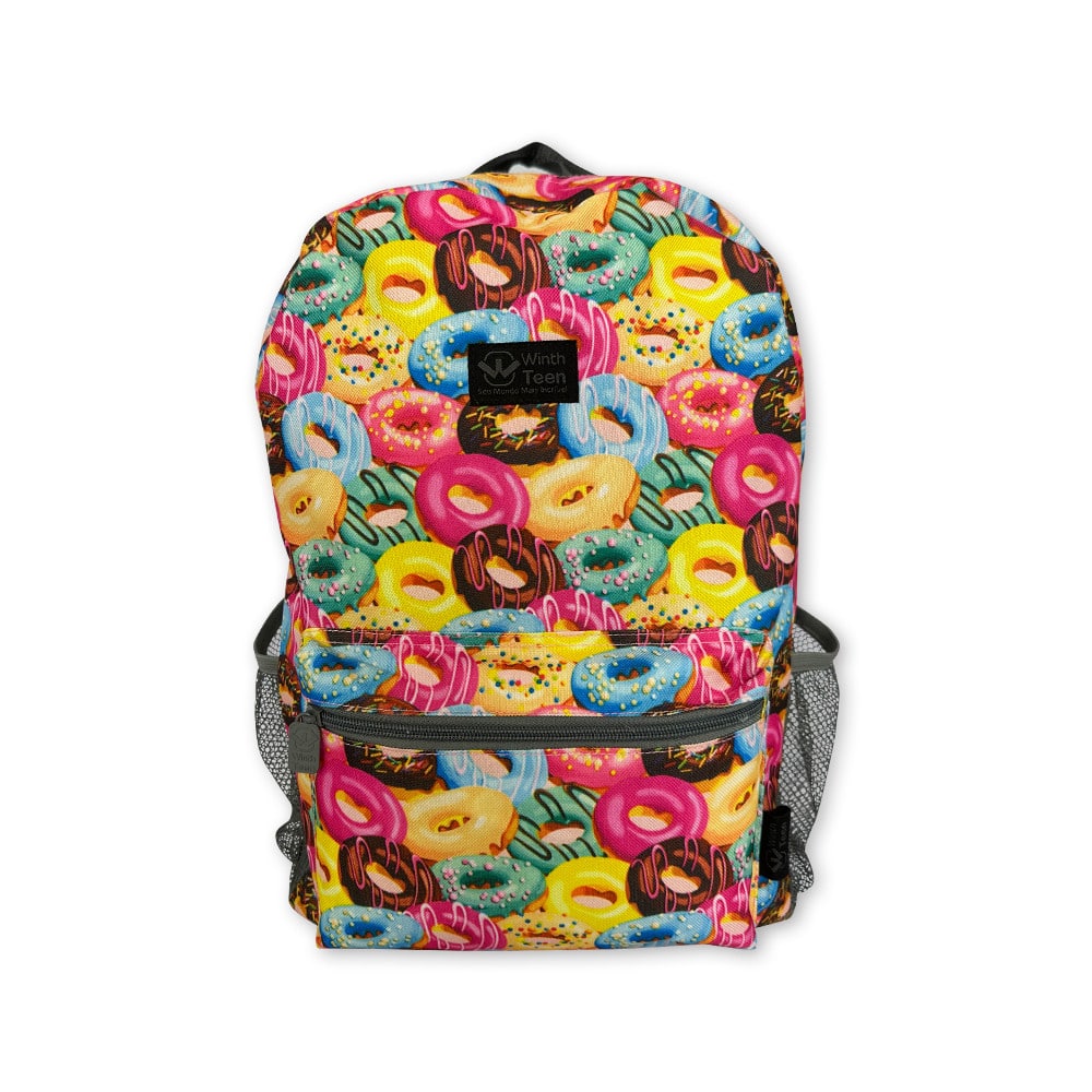 Mochila Escolar Donuts com Lancheira e Estojo Esse kit de mochila é perfeito para levar todos os seus pertences e materiais escolares, de forma organizada e estilosa! Vem com uma mochila super espaçosa com bolso externo frontal e dois bolsos de redinha para colocar garrafas. Além disso, vem com um estojo e uma lancheira térmica.