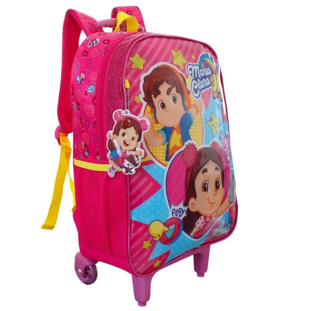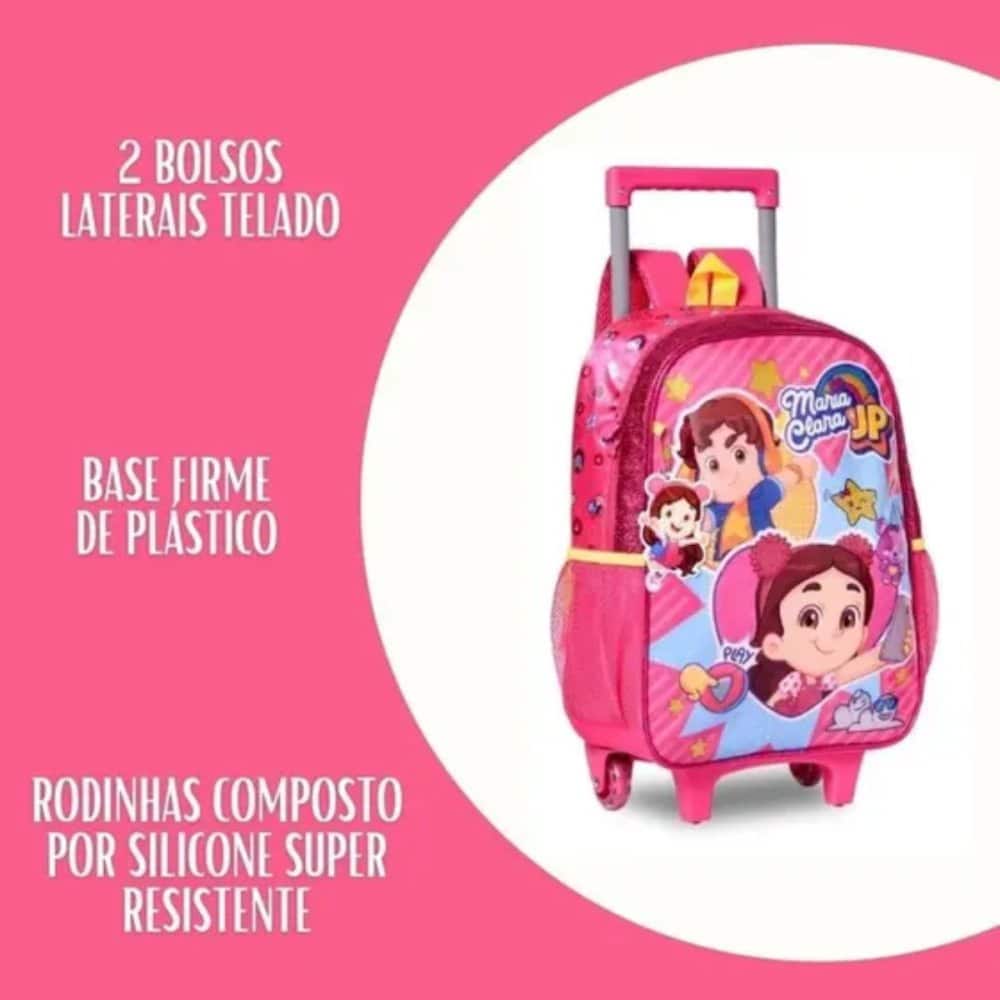 As Mochilas de Rodinhas Maria Clara & JP são feitas de poliéster resistente, apresentando uma frente em PVC que brilha com encantadores detalhes de glitter. Acompanha um chaveiro divertido, tornando a mochila ainda mais especial. Com um espaço amplo, ela é ideal para acomodar tudo o que os pequenos aventureiros precisam, desde livros até brinquedos, sendo perfeita para a escola, viagens e passeios. O design vibrante reflete a alegria e o carisma de Maria Clara & JP, tornando esta mochila a escolha ideal para crianças que adoram explorar. O toque de glitter e o chaveiro adicionam um charme extra, transformando-a em um acessório que as crianças vão adorar. Proporcione a elas a oportunidade de viver suas próprias aventuras, onde conforto e diversão se unem para tornar cada jornada uma experiência única e emocionante! Com compartimento único e amplo, redinhas laterais para armazenar garrafinhas, alça de mão, alça de costas acolchoadas e reguláveis, duas rodinhas de silicone com glitter, e dois apoios frontais. ESPECIFICAÇÕES;