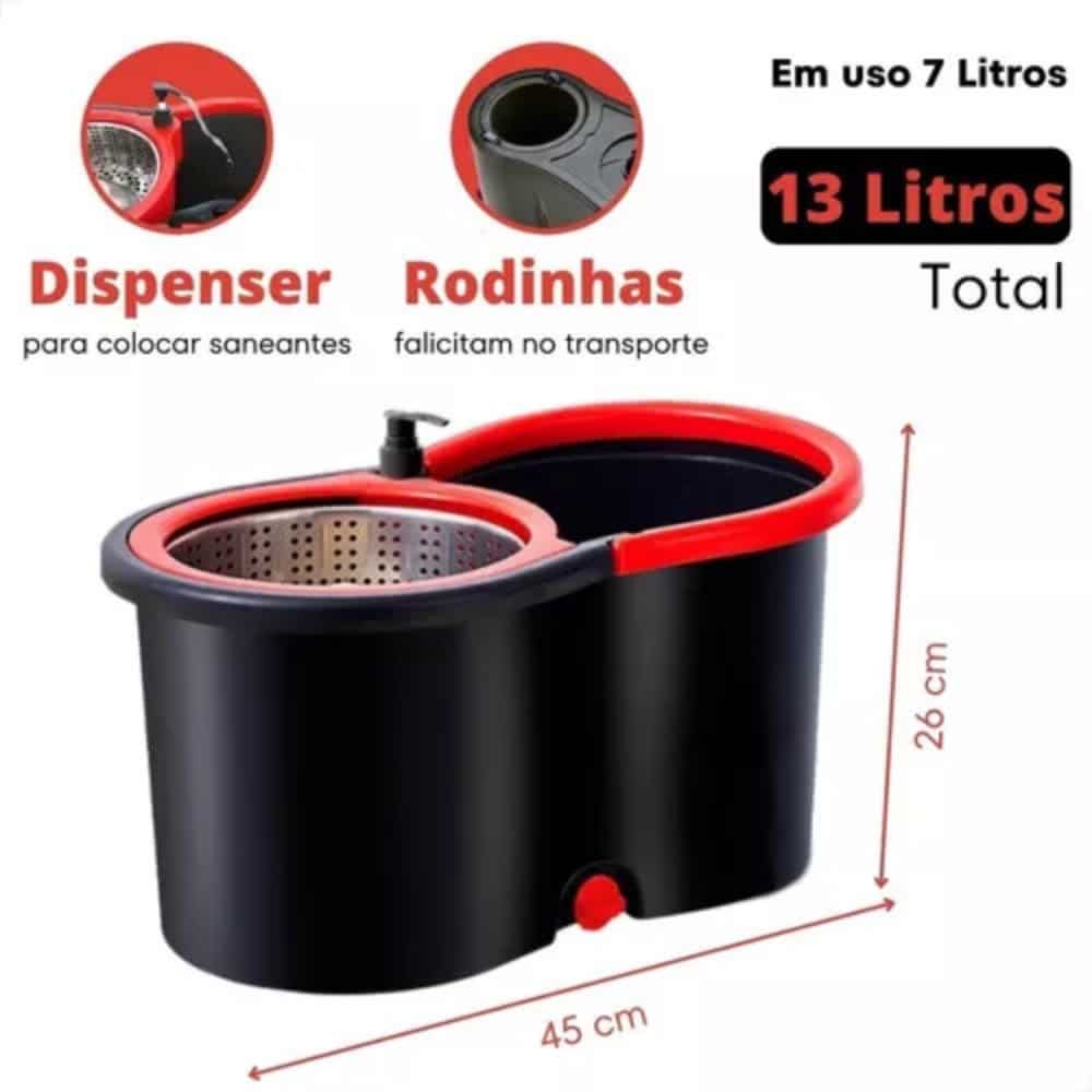 Balde: Alt.: 21cmBalde: Capacidade total de 13 litros, com uso recomendado de 7 litrosCabo: 125 cm total, dividido em 3 partes para fácil armazenamentoRefil: 100% microfibra, removível e lavávelComposição: Polipropileno, aço inox e poliéster