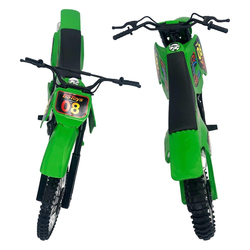 Moto de Motocross de Brinquedo com Apoio – Verde Para aqueles que desejam ser verdadeiros pilotos de motocross, essa incrível moto será a escolha certa! Com um design realista e detalhado, a moto conta com adesivos em todo seu corpo, além de seu motor cromado, dando ainda mais estilo ao brinquedo.Conta com um amortecedor traseiro, que trará ainda mais imersão na brincadeira, tornando a experiência de pilotagem mais realista, e pneus emborrachados, para que possa fazer diversas curvas, fazendo com que a brincadeira possa ser tanto dentro de casa, como fora dela. Além disso, a moto conta com apoio para que possa ficar em pé, fazendo com que aqueles que amam colecionar, possam deixar a moto como item decorativo em sua casa. Feita com materiais de alta qualidade, o brinquedo garante uma ótima durabilidade e resistência, para que não quebre, dando mais segurança na hora da brincadeira.